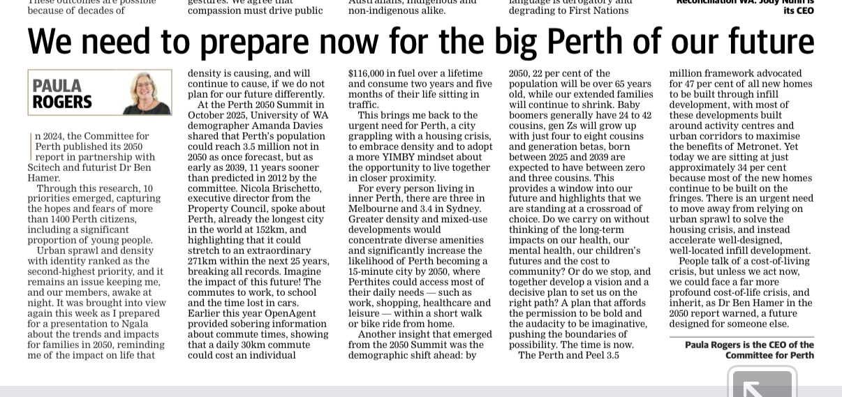 In 2024, Committee for Perth published the 2050 report in partnership with Scitech and futurist Dr Ben Hamer. Through this research ten priorities emerged, capturing the hopes and fears of over 1,400 Perth citizens including a significant proportion of young people. Urban sprawl and density with identity ranked as the second-highest priority, and it remains an issue keeping me, and our members, awake at night. It was brought into view again this week as I prepared for a presentation to Ngala about the trends and impacts for families in 2050, reminding me of the impact on life that density is causing, and will continue to cause, if we do not plan for our future differently.